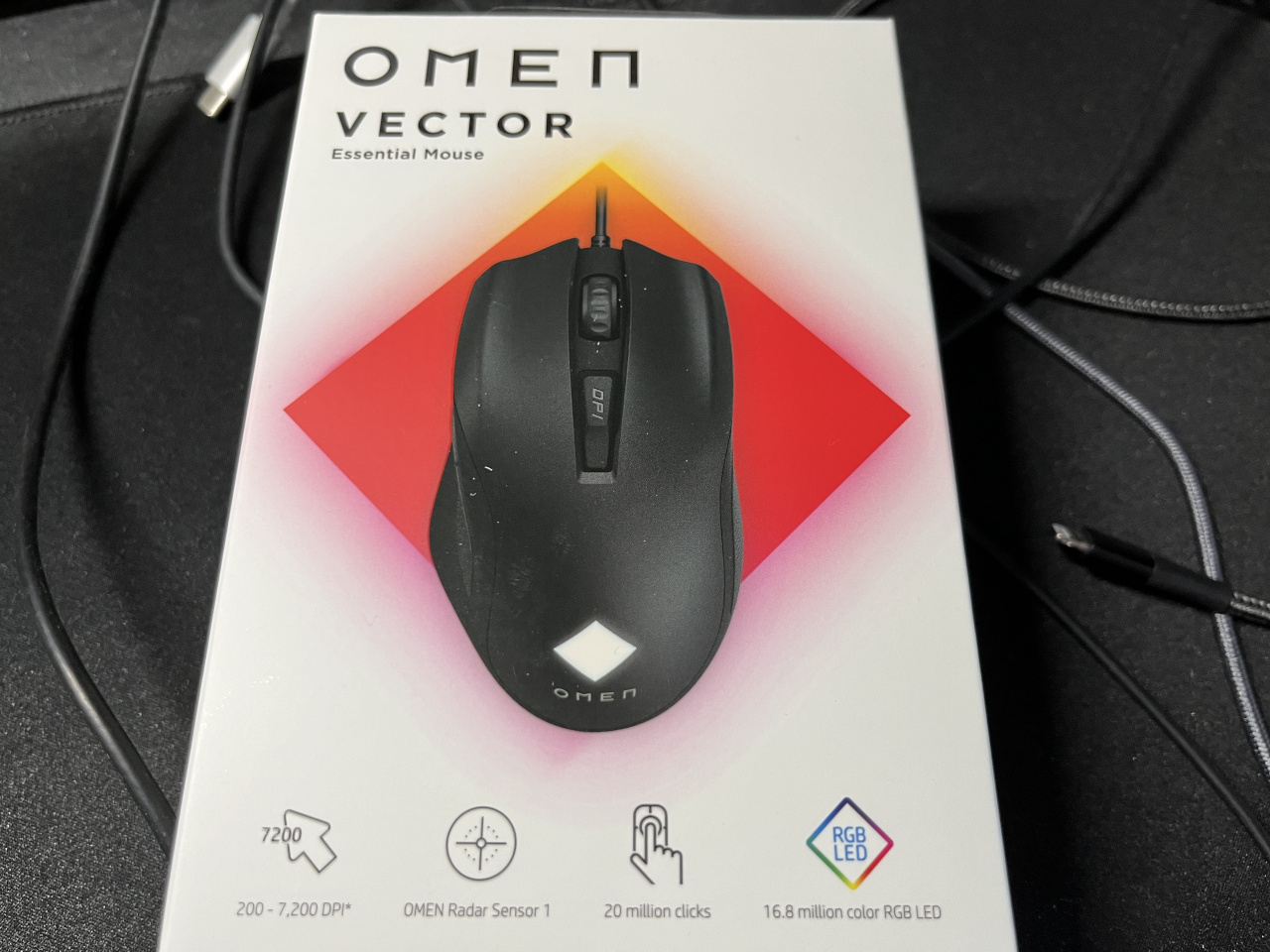 こちらがマウス本体。ベーシックな5ボタン有線マウスで、ゲーミングマウスよろしくDPIの変更ボタンが搭載されているほか、手前のロゴはRGBに光らせることができます。これらは「OMEN Gaming Hub」という専用ソフトから設定を変更することができます(「OMEN」と冠していますがVictusにもプリインストールされています)。
